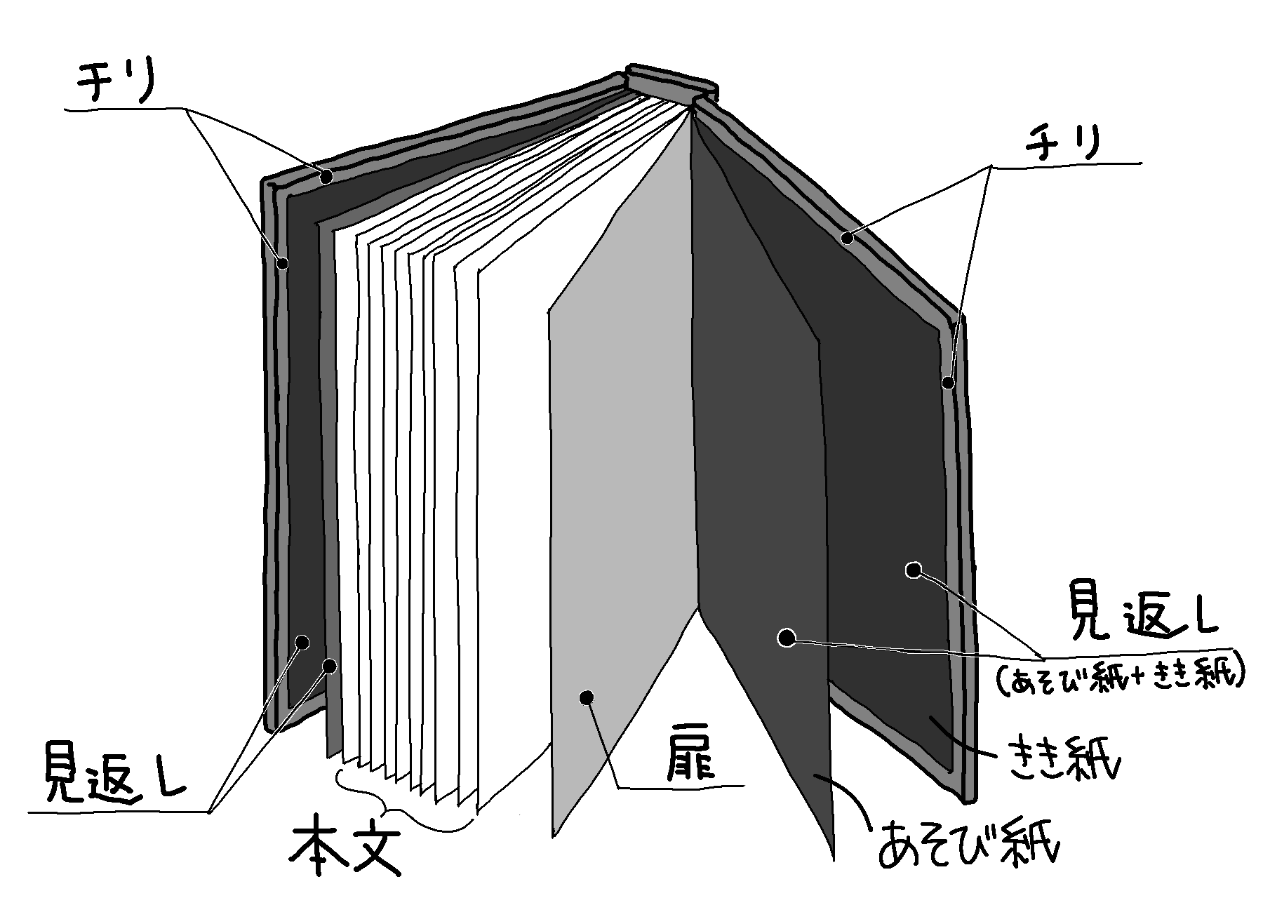 ③チリ、見返し(きき紙+遊び紙)、トビラ、本文(ほんもん)