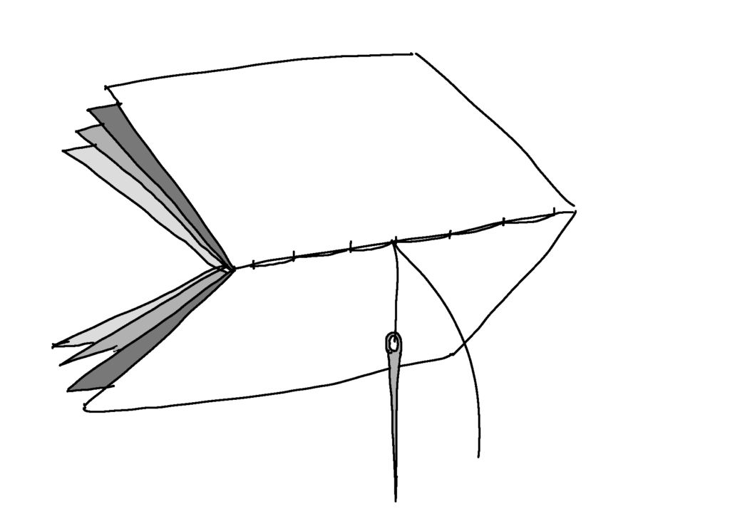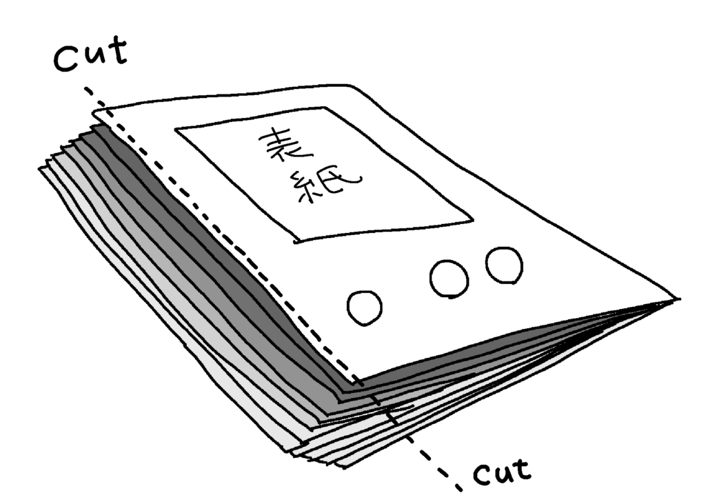 次は僕が「かんたん糸とじ本」と呼んでいる製本方法をご紹介します。製本の分類としてはこれも中綴じ製本です。これは、ホッチキスのかわりに糸と針を使って綴じていく製本方法です。表紙だけ少し分厚い紙にしたり、色を変えたりすると雰囲気が出るのでおすすめです。