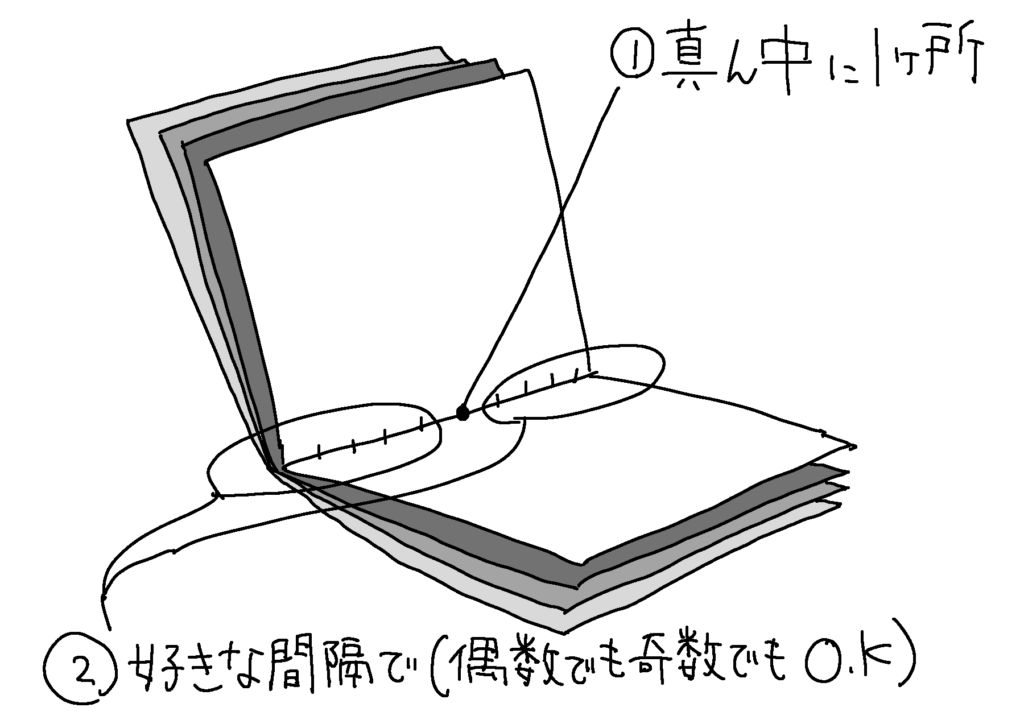 ②用紙を正しい順番に並べ、下穴の位置を鉛筆で薄く描きます。真ん中にひとつ、両端にひとつずつ、そのあいだに好きな間隔で印をつけてください。穴の数は奇数でも偶数でも細かくても粗くでもなんでもOKです。