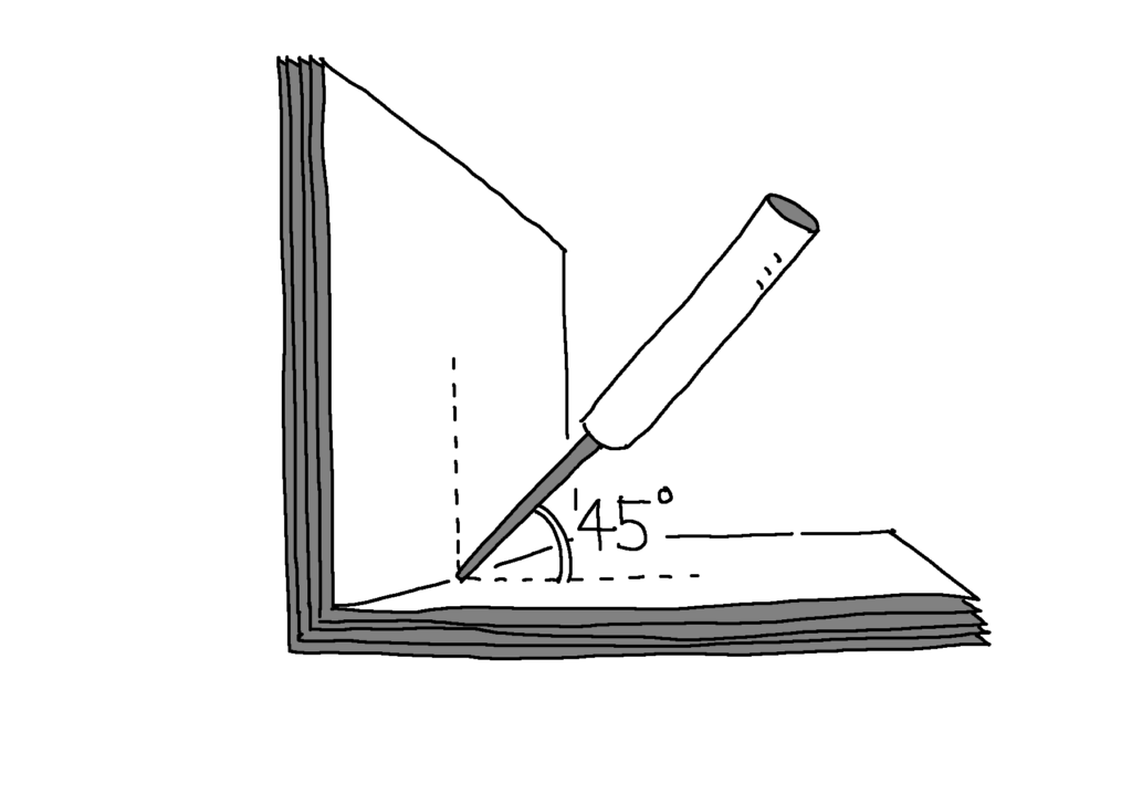 ③真ん中のページで本を90度に立て、斜め45度にキリを刺して下穴をあけます。