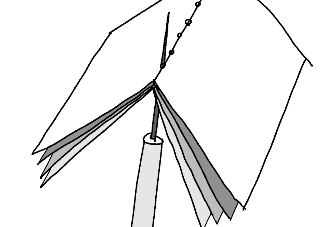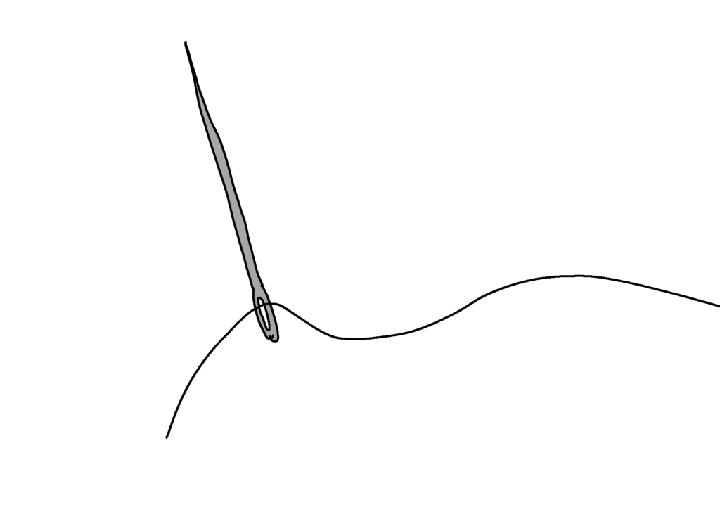 ⑥真ん中の穴に外側から針を入れます。端部は後で結べるように5から10センチほど出しておきます。