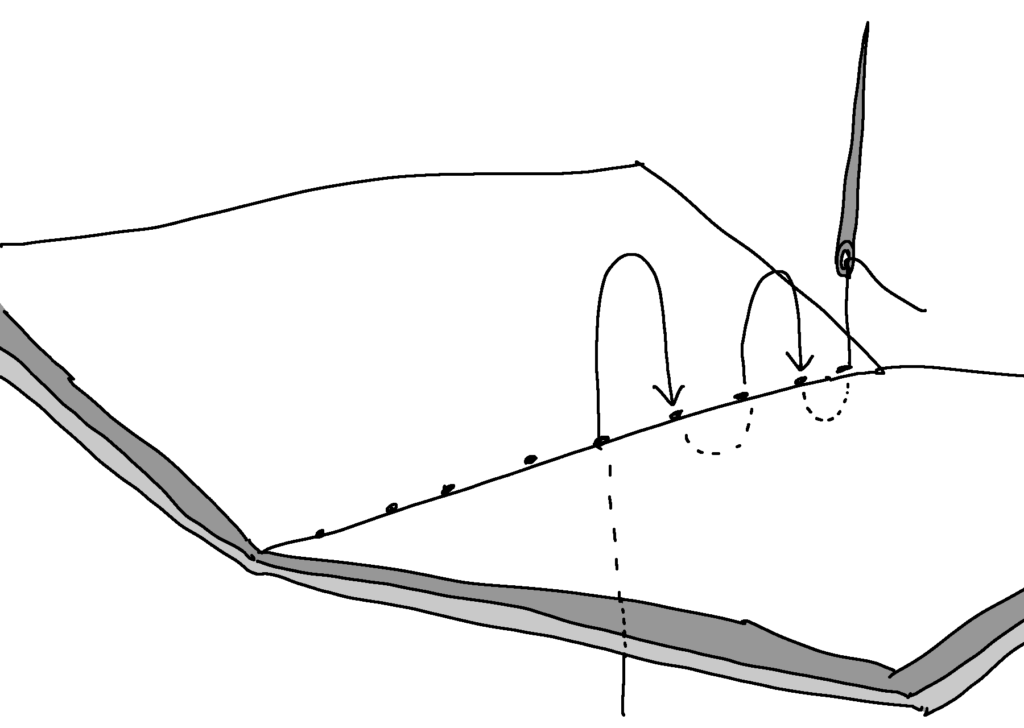 ⑨真ん中の穴は飛び越えて反対側も縫っていきます。