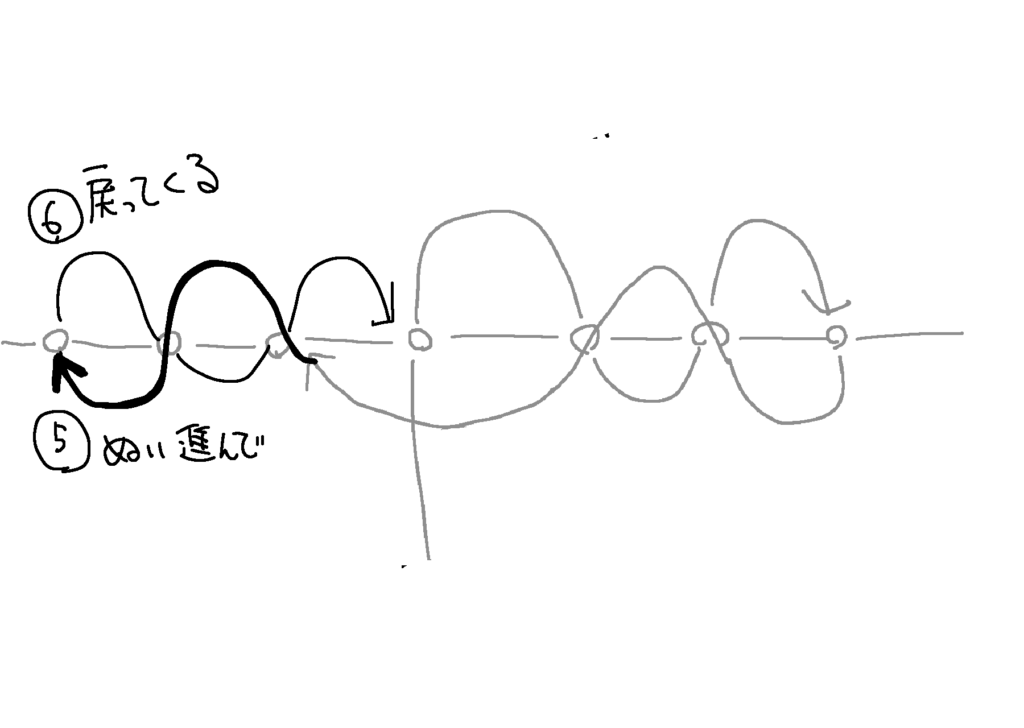 ⑪そうすると、真ん中の穴に戻った時には、内側から外側へ針を通すことになるはずです。
